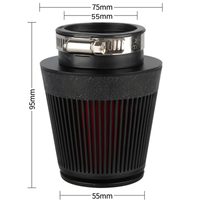 it is a high quality air filter. The upper part of the filter is aluminium alloy and ABS with wear-resistant coating to protect the filter from damage. The design of the filter body is designed for higher air intake, improving the gas response and increasing performance. The inner part of the filter is a foam sponge that makes even the finest impurities and dust. The filter is washable and usable again. This air filter has a 55mm mounting diameter, a total length of 95mm.