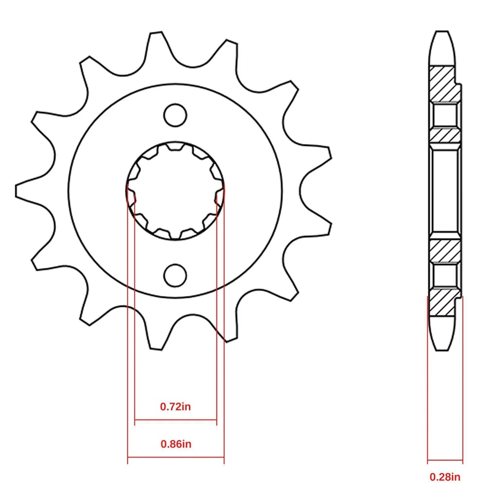 Diameter of top of tooth: 0,72 inches Diameter of the valley of tooth: 0,86 cm Thickness: 0,28 inches, 0.7 cm
