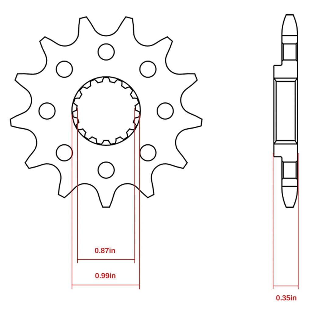 Diameter of top of tooth: 0,87 inches, 2.2 cm Diameter of the valley of tooth: 0.99 inches, 2.5 cm Thickness: 0,35 inches, 0.9 cm