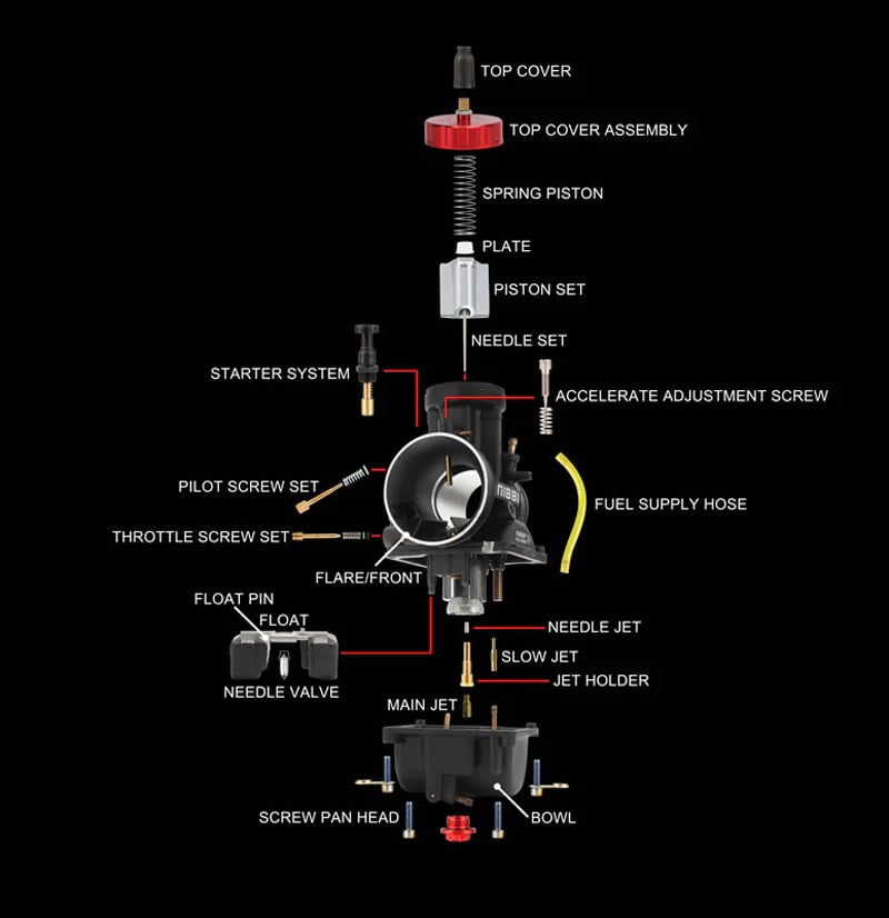is most commonly used for 2T and 4T engines 450cc-500cc quadricycles, motorcycles and go-kars. Thanks to the excellent technology, the NIBBI RACING carburettors are perfectly tuned for better performance (5-10% more than normal carburettor) and have faster gas response. Nibbi Racing PWK carburetors are the perfect solution to improve vehicle performance. Aluminium alloy with anodic oxidation treatment which significantly improves corrosion resistance, wear resistance, insulation, thermal resistance and hardness of the carburetor. To achieve the best results, we also recommend buying the NIBBI RACING air filter. Accessible idle and mixture settings. The carburetor requires a rubber flange. The package includes a set of nozzles